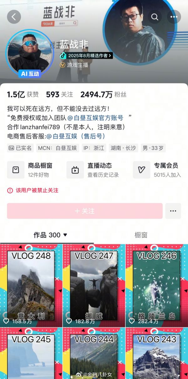 #蓝战非被禁止关注#八妹搜索发现,前两日自曝收入的网红蓝战非抖音、小红书账号被禁止关注[吃惊]