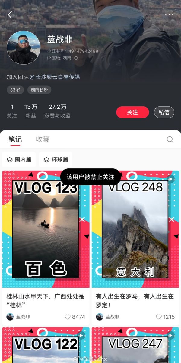 网红蓝战非抖音小红书账号被禁止关注