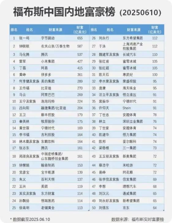 当然还有一种声音认为,张一鸣已经由一个买不起苹果手机的穷小子变成了身价数千亿元的超级富豪,此时的退休也算是功成身退。2025年6月的实时富豪榜,张一鸣一度反超农夫山泉钟睒睒位居首富,虽然后期又被钟睒睒重新夺回首富之位,但张一鸣已经长期位居中国富豪榜前五位。