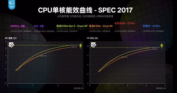 9月25日,@极客湾Geekerwan对新发布的第五代骁龙8至尊版进行了性能测试。一个比较令人震惊的结果是,在SPEC 2017套件上,作为一款今年上半年发布的芯片,玄戒O1的“性能核”能效表现逼近了刚发布骁龙8Gen 5,“能效核”表现甚至超过了后者。