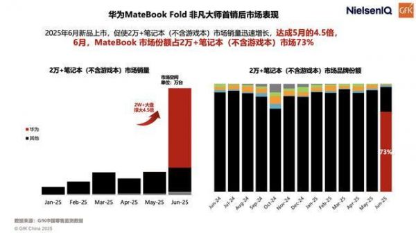 GFK最新数据显示,华为MateBook Fold 非凡大师在2025年6月上市,上市首月该新品的市场份额占2W+笔记本(不含游戏本)市场的73%,并促使2W+笔记本(不含游戏本)市场销量迅速增长,达到5月的4.5倍,一举成为超高端笔记本市场的关注焦点。