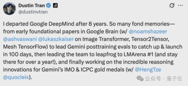 大佬叫Dustin Tran,他是Gemini DeepThink的共同创造者,该模型一经发布便展现出SOTA级别的推理能力,在过去两个月内连斩IMO和ICPC金牌