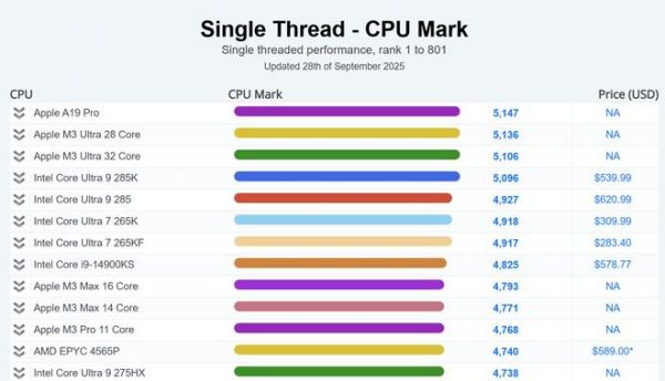 在PassMark本周更新的CPU单核性能排行榜上,A19 Pro力压自家的M3 Ultra,以及英特尔Ultra 9 285K、AMD的EPYC 4565P等桌面级处理器登顶。