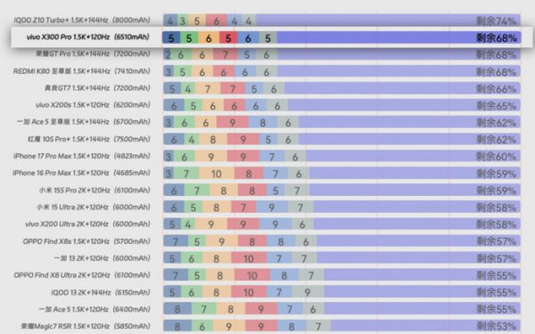 续航方面,有消息称OPPO Find X9系列全系电池容量突破7000mAh,而vivo X300 Pro电池容量为6510mAh。不过根据@小白测评 3小时重度续航测试数据来看,vivo X300 Pro的实际续航表现不输7000mAh级别的手机。
