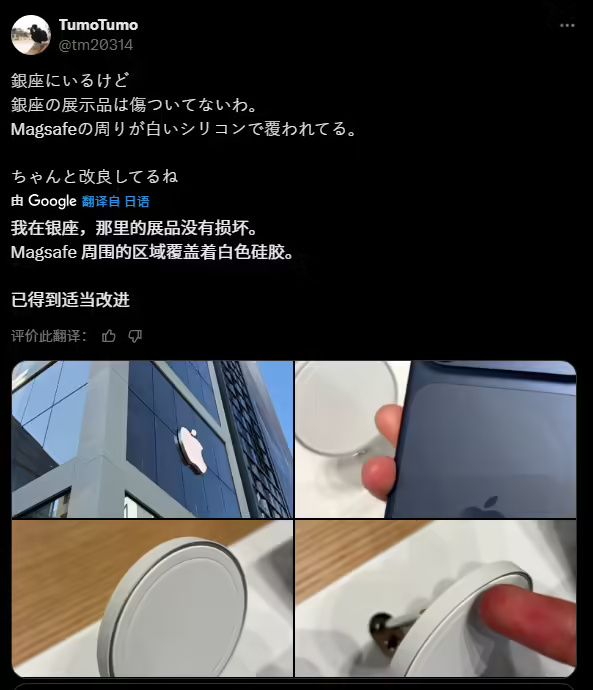 但经苹果调查之后发现,这些展示机上出现的大部分掉漆,其实是沾上了无线充电支架上老化的材质,清洁一下就能去除;至于部分划痕,则是被支架上的金属环磨损导致的。对此,苹果开始为线下门店更换新的展示支架,目前已经陆续覆盖全球范围内的多家门店。