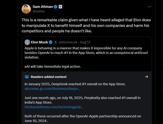 5. 2025年8月,起诉苹果和OpenAI涉嫌垄断,通过“反竞争手段”来打压AI竞争对手,声称苹果在App Store排名中偏向OpenAI,并降低xAI的社交媒体应用X和Grok的优先级。