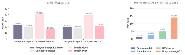 采用了常用于评估图像生成效果的GSB(好/一样/差)评价方法。总共使用了1000个文本提示,100多名专业评估人员,混元图像3.0与nano banana和字节跳动的Seedream,以及GPT-IMG对比,一样好的情况占比最多,而深灰色部分,则代表混元图像3.0更好,浅灰色代表用来对比的模型更好。