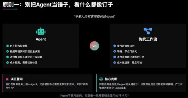 举个例子,如果你的场景是每单任务预算只有几毛钱的高并发客服系统,那么用传统工作流解决 80% 的常见问题,远比用 Agent 去追求 95% 的覆盖率要明智得多。