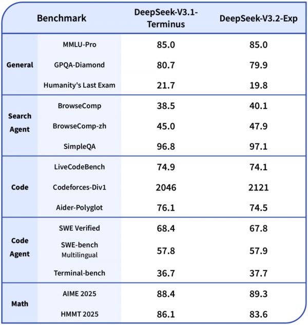 为了评估引入稀疏注意力机制的影响,DeepSeek方面特意将DeepSeek-V3.2-Exp的训练配置与V3.1-Terminus进行了对齐。在各个领域的公开基准测试中,DeepSeek-V3.2-Exp的表现与V3.1-Terminus相当。