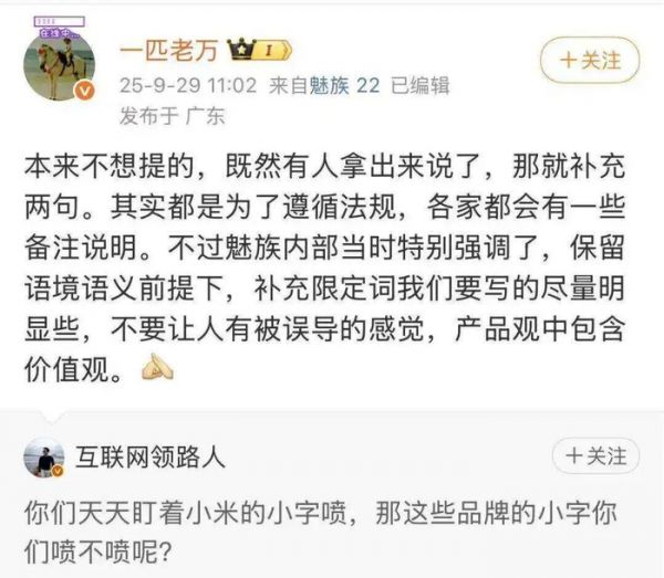 星纪魅族集团中国区CMO万志强在社交平台上回应,他说,加小字并不是为了哗众取宠,而是为了合规。