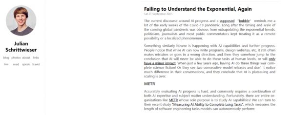 AI明星公司Anthropic的研究员Julian Schrittwieser在其个人博客中撰文警告,当前对AI“泡沫”或“平台期”的普遍质疑,是对技术指数级增长趋势的严重误读,这种心态与新冠疫情初期对指数级传播的忽视如出一辙。