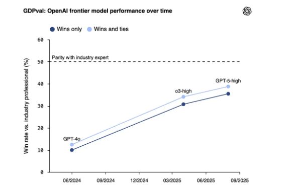 针对“AI仅在软件工程领域表现出色”的质疑,Schrittwieser引用了OpenAI发布的另一项名为GDPval的评估。该研究旨在衡量模型在更广泛经济活动中的表现,涵盖了9个行业的44个职业,任务由平均拥有14年经验的行业专家提供。