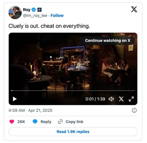 当女生谈论艺术品时,Roy不会欣赏,Cluely立即给他提供了相关的知识点让他附和。但最终这段对话露馅,女生愤然离席,该视频在网上爆红,引发对“AI约会作弊”的热议。