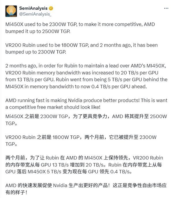 例如,MI450的TGP功耗从最初的数值增加了200W,而作为回应,Vera Rubin的TGP则增加了500W,达到2300W。