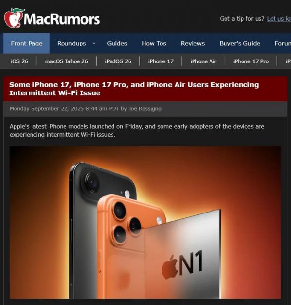 真机到手后,一些iPhone 17系列新机用户又反馈说,出现了“Wi-Fi间歇性断连”的问题。