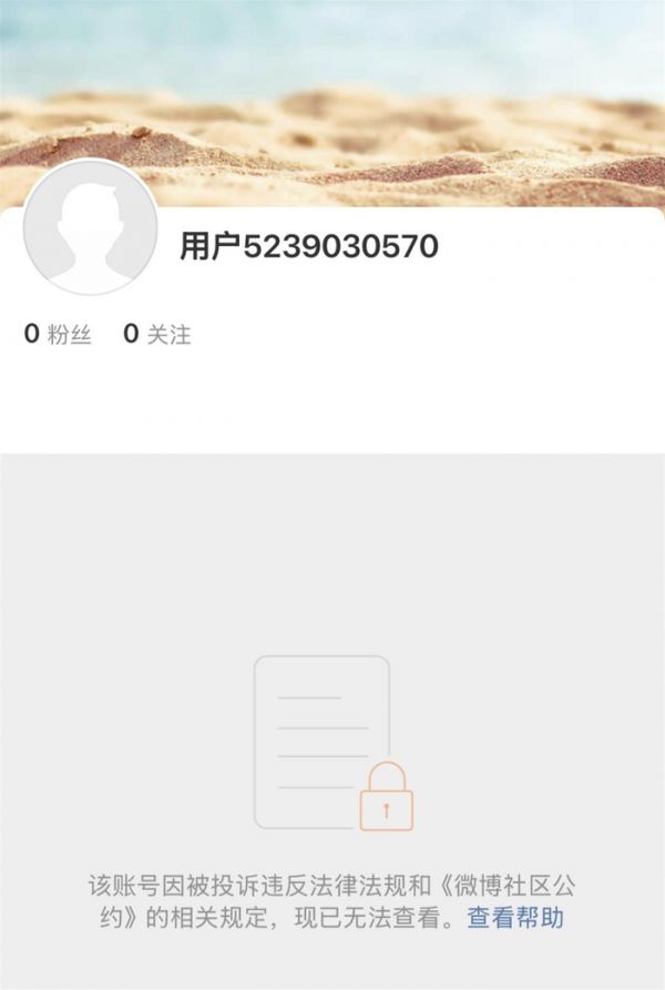户晨风微博账号截图其微博账号页面显示:该账号因被投诉违反法律法规和《微博社区公约》的相关规定,现已无法查看。账号头像变灰,关注及粉丝数量清零。