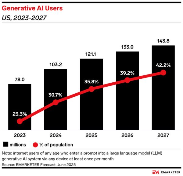 这个对比很能说明问题,AI带来的流量增长还远远无法弥补传统搜索流量的下降。但增长趋势不容忽视,根据Similarweb的数据,ChatGPT对新闻网站的推荐流量在2024-2025年间增长了25倍