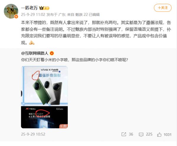 有意思的是,星纪魅族的 CMO 万志强昨天也凑了热闹,说加小字其实就是为了按规矩办事,市面上大家都会加备注。但魅族内部特意要求限定词要写得明显些,不能打擦边球误导消费者,还特别强调“做产品其实就是在践行价值观”。