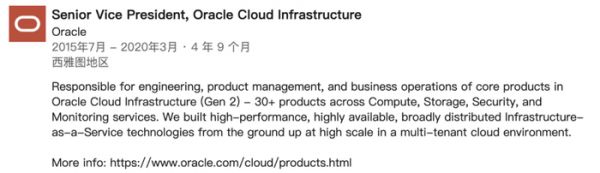 他还在 Oracle 担任云基础设施高级副总裁,主要负责 Oracle 云基础设施(第二代)核心产品的工程、产品管理和业务运营,涵盖计算、存储、安全和监控服务的 30 多个产品。