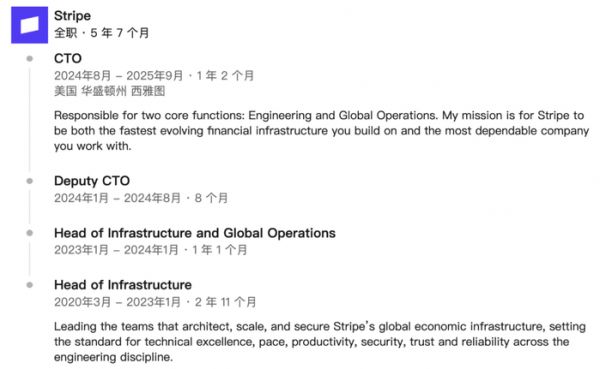 他此前曾在 Stripe 担任技术职位(包括 CTO)五年,主要负责基础设施、工程和全球运营。