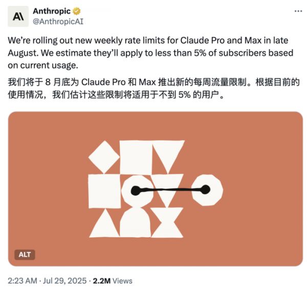 今年 7 月,公司推出了 Claude Code 的新使用限制,针对那些「24/7 持续后台运行应用程序」的高频用户。根据新规则,用户每周 Claude Sonnet 的使用时间限制在 240 到 480 小时之间,Claude Opus 4 的使用时间则限制在 24 到 40 小时之间,具体取决于基础设施的负载。