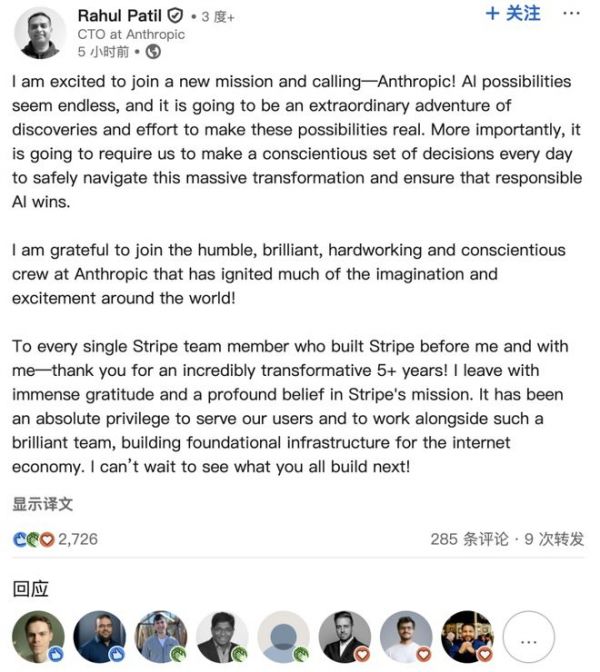 Rahul Patil在LinkedIn公布了职务更新的消息,表达了自己加入Anthropic的激动之情以及对未来的期许: