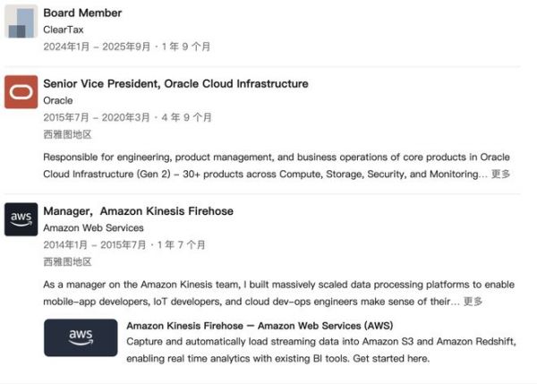 他还在Oracle出任过云基础设施高级副总裁,并在亚马逊和微软担任过工程职务。