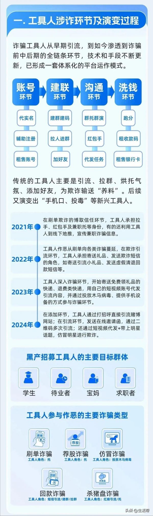 此前,微信安全中心发布《工具人帮助犯罪研究报告》,从演变过程及作恶类型讲述“工具人”作案手法,希望通过手法科普,帮助大家识别相关套路,拒做电诈“工具人”。