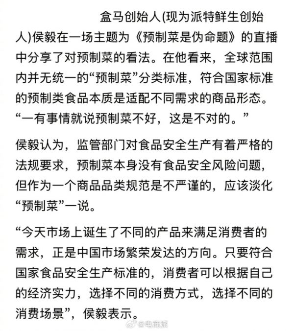 盒马前CEO侯毅称预制菜被污名化