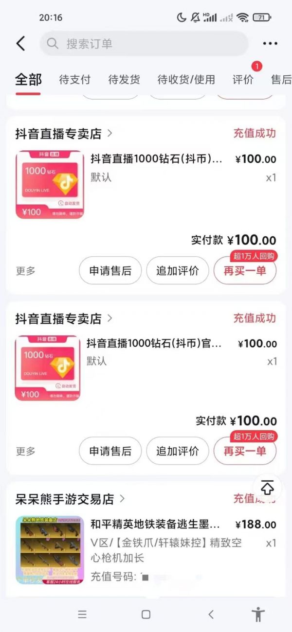 曹先生儿子在抖音打赏直播与购买游戏装备的部分订单。受访者供图13岁男孩用花呗花了7万元