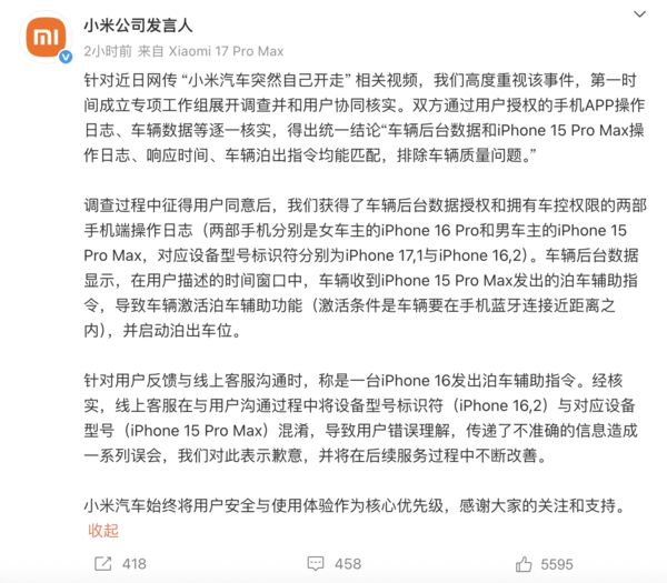 对此,小米官方表示,小米第一时间成立专项工作组展开调查并和用户协同核实。双方通过用户授权的手机App操作日志、车辆数据等逐一核实,得出统一结论“车辆后台数据和iPhone 15 Pro Max操作日志、响应时间、车辆泊出指令均能匹配,排除车辆质量问题。”