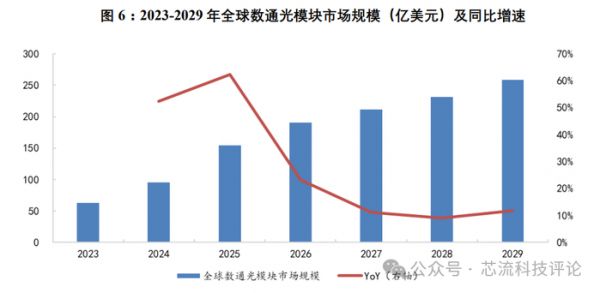 Light Counting数据显示,2023年全球数通光模块市场规模达到62.5亿美元,未来预计以27%的CAGR增长,2029年有望达到258亿美元。