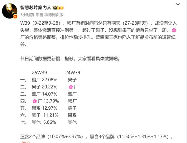 以下是2025年第39周中国手机市场份额的具体数据: