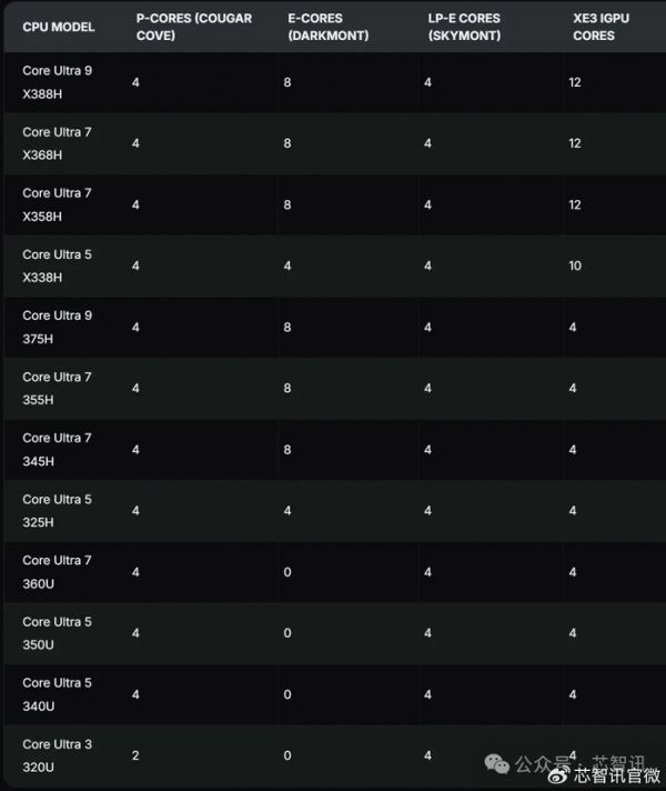 首批的4个常规的Core Ultra H系列分别为Core Ultra 9 375H、Core Ultra 7 355H、Core Ultra 7 345H和Core Ultra 5 325H。其中,前三款均配备了4个P核、8个E核、4个LPE核心,而Core Ultra 5 325H则只有4个E核心,这四款SKU均配备了4个Xe3 GPU内核。