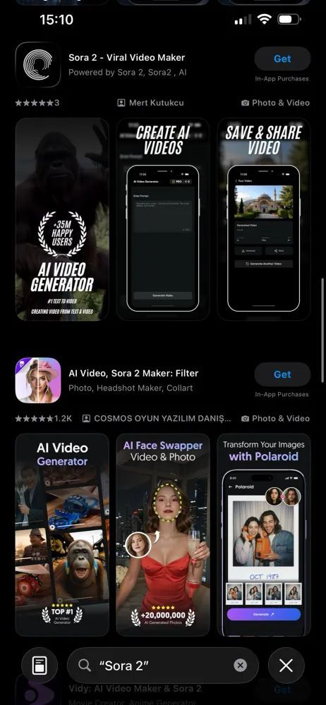 类似的山寨应用远不止一个。经该媒体搜索发现,以“Sora 2”为关键词可以找到约十几个相关应用。
