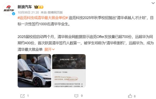 10月7日消息,据新浪汽车报道,追觅科技在2025年秋季校招中抛出“清华卓越人才计划”,目标直指一次性招募1000名清华学子。此举使其在签约人数上超越华为,首次跃居清华毕业生最大就业单位。