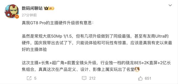博主:真我GT8 Pro影像有几项升级做到了同级最强