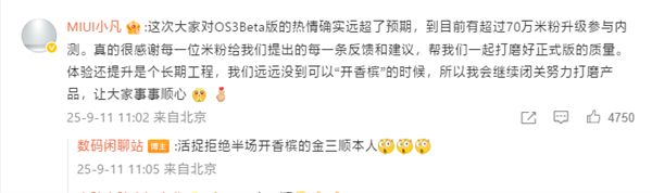 9月11日,他在一位数码博主的评论区留言,透露已有超过70万米粉参与了澎湃OS 3 Beta版内测,并表示「远未到开香槟的时候」,自己会「继续闭关打磨产品」。
