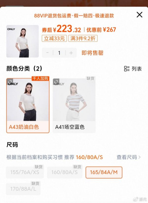 再一个是供给端的问题。仍以ONLY为例,通过闪购入口进入门店页面,虽然几乎所有品类都标注支持即时零售,但真正能下单的SKU寥寥无几。比如某款短袖,仅单一色号、单一码数有库存,其余均已售罄。