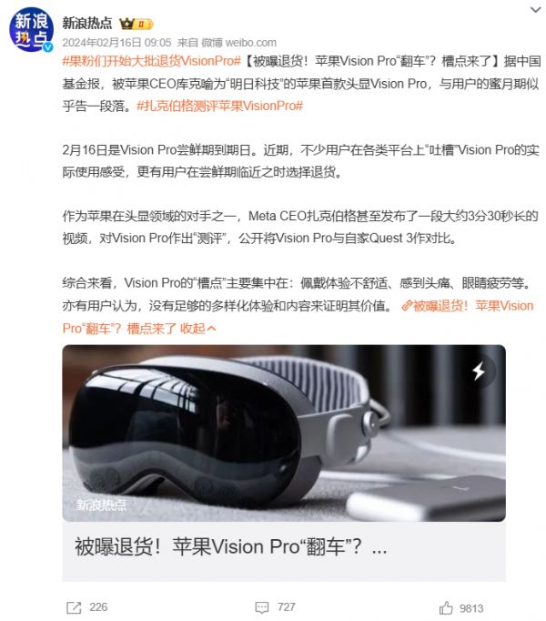 Vision Pro 去年上市时引发抢购,但仅半个月就出现退货潮。不少用户抱怨设备太重、视觉体验不佳等问题。