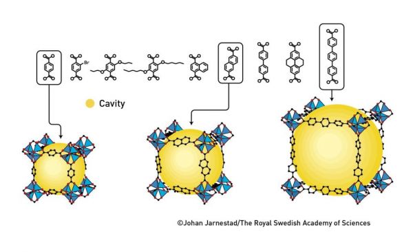图6.二十一世纪初,奥马尔·亚吉证实可构建系列化MOF材料。通过调控分子连接体,成功获得具备不同性质的材料,包括16种具有不同孔径的MOF-5变体。©Johan Jarnestad/瑞典皇家科学院