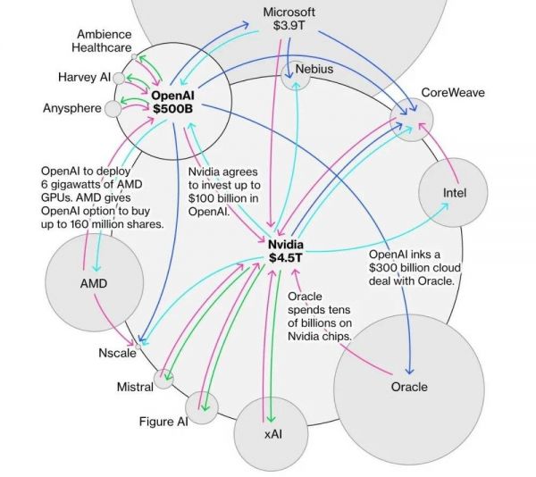——结果就是英伟达无需自己修建和拥有数据中心,就可以从硬件销售和云服务中产生持续性收入;而甲骨文向英伟达、OpenAI等公司出租算力资源,将资本支出转化为运营支出/收入;参与到交易中的所有公司,都因为AI的热火朝天而市值/估值暴增。