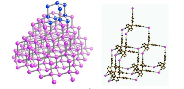 左边是钻石结构。右边是铜 I-四腈骨架,具有相同的结构,但在骨架内部引入了大量空间。