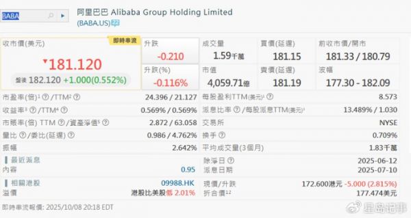 截至10月8日收盘,阿里巴巴美股报收181.120美元/股,跌-0.116%,总市值为4059.71亿美元。