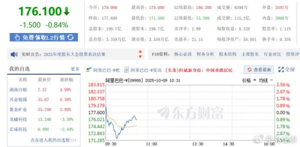 截至10月9日10时30分,阿里巴巴港股开盘报176.1港元/股,下跌0.84%。