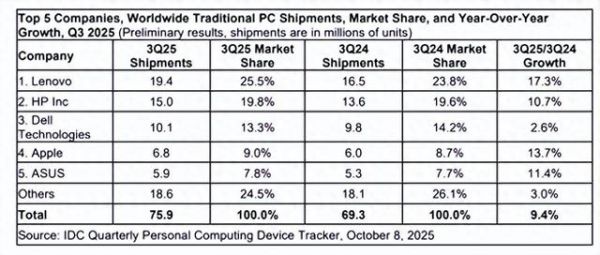 快科技10月9日消息,根据国际数据公司IDC最新数据,2025年第三季度,全球传统个人电脑(包括台式机、笔记本电脑和工作站)出货总量达到7590万台,相较于去年同期(6930万台)增长了9.4%。