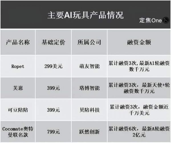 这两大方向均已出现代表性公司,比如萌友智能(Ropet)、珞博智能(芙崽)、贝陪科技(可豆陪陪)、跃然创新(BubblePal、CocoMate系列)等。目前国内融资金额最高的AI玩具公司为跃然创新,产品偏重潮玩逻辑,由于手握小猪佩奇、奥特曼、奶龙等知名大热IP的授权,此标签也在一定程度上拉高了市场对该公司的估值。