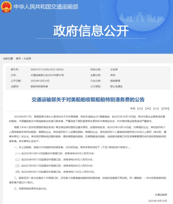 三是,中国对美国船只授权“进港特别服务费”。只要是悬挂美国国旗,注册在美国国籍,或者在美国制造的所有商船,停靠中国港口,都要额外收取进港费。为什么呢?因为这是一种对等反击。是特朗普先对中国商船,收取“进港特别服务费”的,中国只是自卫反击,对美国实施对等征税。