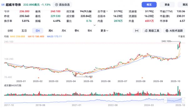 2025年10月6日当天,AMD股价开盘后直接跳涨超过30%,最高触及215美元每股,最终收涨23.71%。