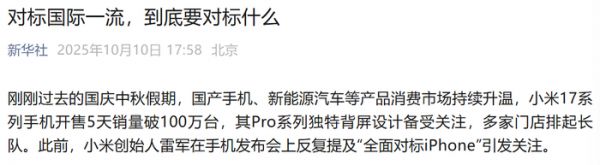电动知家消息,10月10日,新华社发表评论文章,点评小米“全面对标苹果”的现象。小米17系列在国庆假期销量很火,5天销量突破100万台,门店排长队。雷军之前一直在说“全面对标iPhone”,新华社评论文章开篇设问“对标国际一流,到底要对标什么”?